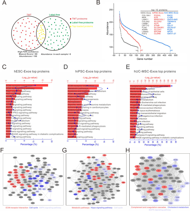 Methods: In this study, we isolated exosomes from hESCs, hiPSCs, and human umbilical cord mesenchymal stem cells (hUC-MSCs) via classic ultracentrifugation and a 0.22-μm filter, followed by the conservative identification. Tandem mass tag labeling and label-free relative peptide quantification together defined their proteomics. High-throughput sequencing was performed to determine miRNA profiles. Then, we conducted a bioinformatics analysis to identify the dominant biological processes and pathways modulated by exosome cargos. Finally, the western blot and RT-qPCR were performed to detect the actual loads of proteins and miRNAs in three types of exosomes.