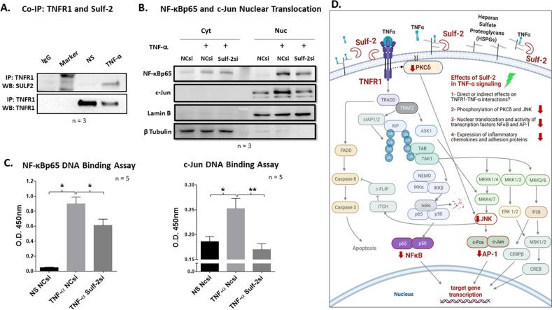 Extracellular sulfatase-2 (Sulf-2) influences receptor-ligand binding and subsequent signaling by chemokines and growth factors, yet Sulf-2 remains unexplored in inflammatory cytokine signaling in the context of rheumatoid arthritis (RA). In the present study, we characterized Sulf-2 expression in RA and investigated its potential role in TNF-α-induced synovial inflammation using primary human RA synovial fibroblasts (RASFs). Sulf-2 expression was significantly higher in serum and synovial tissues from patients with RA and in synovium and serum from hTNFtg mice. RNA sequencing analysis of TNF-α-stimulated RASFs showed that Sulf-2 siRNA modulated ~2500 genes compared to scrambled siRNA. Ingenuity Pathway Analysis of RNA sequencing data identified Sulf-2 as a primary target in fibroblasts and macrophages in RA. Western blot, ELISA, and qRT‒PCR analyses confirmed that Sulf-2 knockdown reduced the TNF-α-induced expression of ICAM1, VCAM1, CAD11, PDPN, CCL5, CX3CL1, CXCL10, and CXCL11. Signaling studies identified the protein kinase C-delta (PKCδ) and c-Jun N-terminal kinase (JNK) pathways as key in the TNF-α-mediated induction of proteins related to cellular adhesion and invasion. Knockdown of Sulf-2 abrogated TNF-α-induced RASF proliferation. Sulf-2 knockdown with siRNA and inhibition by OKN-007 suppressed the TNF-α-induced phosphorylation of PKCδ and JNK, thereby suppressing the nuclear translocation and DNA binding activity of the transcription factors AP-1 and NF-κBp65 in human RASFs. Interestingly, Sulf-2 expression positively correlated with the expression of TNF receptor 1, and coimmunoprecipitation assays demonstrated the binding of these two proteins, suggesting they exhibit crosstalk in TNF-α signaling. This study identified a novel role of Sulf-2 in TNF-α signaling and the activation of RA synoviocytes, providing the rationale for evaluating the therapeutic targeting of Sulf-2 in preclinical models of RA.