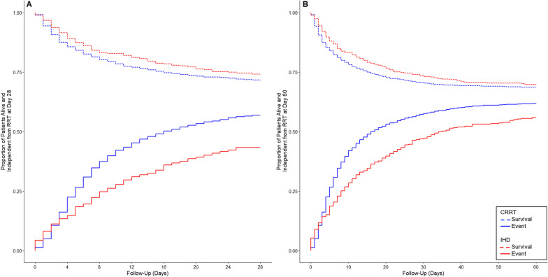 Conclusions: There was no difference in RRT dependence at day 28 between IHD and CRRT. However, among survivors and after adjustment, both IHD-first and the ATN treatment protocol were strongly associated with greater risk of RRT dependence at 28 days after randomization. Trial registration NCT00221013 registered September 22, 2005, and NCT00076219 registered January 19, 2004.