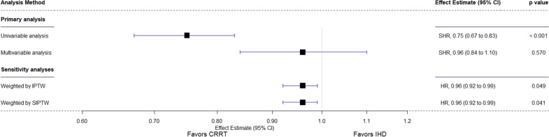 Methods: Primary outcome was 28-day RRT dependence. Secondary outcomes included RRT dependence among survivors and in different SOFA-based treatment protocol groups. We used the Fine-Gray competing-risk model sub-distribution hazard ratio (SHR) to assess the primary outcome. Analyses were adjusted for confounders.