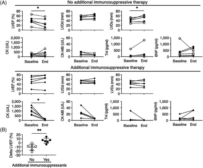 Methods and results: The clinical data of 15 AMA-positive myositis patients with cardiac involvement were retrospectively collected at our centre. To evaluate the effects of immunosuppressive therapy, echocardiographic and laboratory data of patients who received glucocorticoid therapy with additional immunosuppressants (n = 6) and those who did not (n = 6) were compared. Also, the characteristics of patients with or without >5% LV ejection fraction (LVEF) decline during the follow-up period (n = 5 vs. n = 7) were compared. Thirteen patients (87%) had arrhythmias, and eight patients (53%) had LV wall motion abnormalities. Although arrhythmias decreased after treatment, reduced LVEF and LV wall motion abnormalities persisted. Further investigation revealed an increased LV end-systolic dimension and reduced LVEF in patients without additional immunosuppressive therapy, while those in patients with additional immunosuppressive therapy were maintained. Six of seven patients (86%) without LVEF decline received additional immunosuppressive therapy, whereas no patients with LVEF decline had additional immunosuppressive therapy.