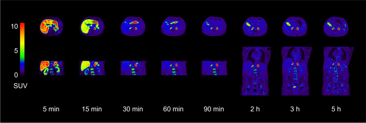 Conclusions: High adrenal uptake combined with a low unspecific liver uptake suggests that 18F]CETO is a suitable tracer for adrenal imaging. Adrenal SUV, based on a whole-body scan at 1 h p.i., correlated well with the net uptake rate Ki.