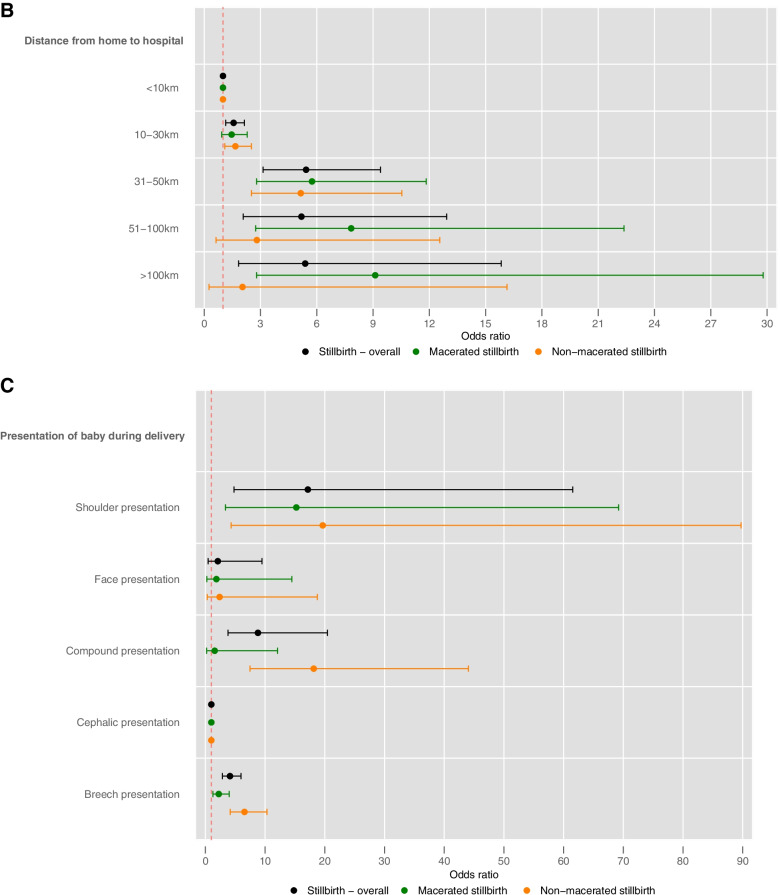 Findings: 1,998 neonates and 1,926 mothers were enrolled. Higher odds of stillbirth were associated with low-levels of maternal education, a further distance to travel to the hospital, living in a shack, maternal hypertension, previous stillbirth, birthing complications, increased duration of labour, antepartum haemorrhage, prolonged or obstructed labour, vaginal breech delivery, emergency caesarean-section, and signs of trauma to the neonate following birth.