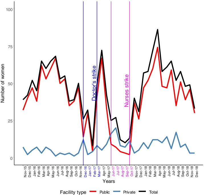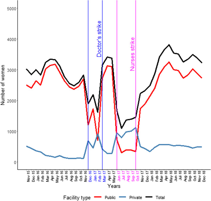 Background: Studies of the impact of health care workers' strikes tend to look at facility-level activity rather than populations, with evidence from low and middle-income countries relatively sparse. This study explored the effect of national strikes on maternal and child health. It looked at the impact on health system activity in both public and non-public sectors (e.g. private, faith-based), on health promotion investments like immunisation, and on disease detection like post-partum haemorrhage (PPH). A 100 day doctors' strike started in December 2016, a 150 day nurses strike from June 2017 and then the clinical officers for 21 days that September.