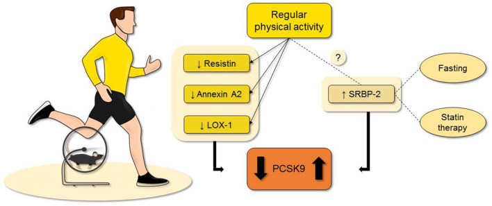 The amount of physical activity (PA) people practice everyday has been reducing in the last decades. Sedentary subjects tend to have an impaired lipid plasma profile with a higher risk of atherosclerosis and related cardio- and cerebrovascular events. Regular PA helps in both primary and secondary cardiovascular prevention because of its beneficial effect on the whole metabolism. Several studies reported lower levels of plasma lipids in trained subjects, but the precise mechanisms by which PA modulates lipoproteins remain only partially described. Thereupon, proprotein convertase subtilisin/kexin type 9 (PCSK9) is a serin protease whose main function is to reduce the amount of low-density lipoprotein cholesterol (LDL-C) receptors, with the direct consequence of reducing LDL-C uptake by the liver and increasing its circulating pool. Accordingly, recently developed PCSK9 inhibitors improved cardiovascular prevention and are increasingly used to reach LDL-C goals in patients at high CV risk. Whether PA can modulate the levels of PCSK9 remains partially explored. Recent studies suggest PA as a negative modulator of such a deleterious CV mediator. Yet the level of evidence is limited. The aim of this review is to summarize the recent reports concerning the regulatory role of PA on PCSK9 plasma levels, highlighting the beneficial role of regular exercise on the prevention of atherosclerosis and overall CV health.