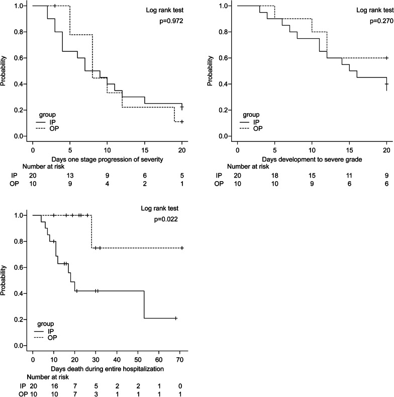 Methods: We retrospectively assessed the characteristics and data of 20 inpatients undergoing hemodialysis who were hospitalized for treatment of diseases other than COVID-19 during the COVID-19 nosocomial outbreak ("inpatient," IP), and of 10 outpatients undergoing hemodialysis who were hospitalized for the care of COVID-19 under outpatient visits ("outpatient," OP).