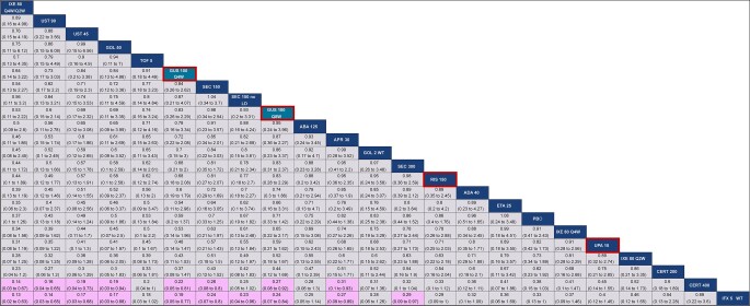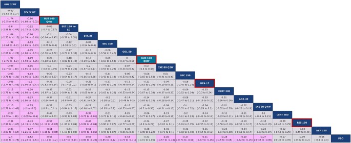 Results: For ACR 20, guselkumab 100 mg every 8 weeks (Q8W) and every 4 weeks (Q4W) were comparable (i.e. overlap in credible intervals) to most other agents, including risankizumab, upadacitinib, subcutaneous TNF inhibitors and most IL-17A inhibitors. For PASI 90, guselkumab Q8W and Q4W were better than multiple agents, including subcutaneous TNF and JAK inhibitors. For vdH-S, guselkumab Q8W was similar to risankizumab, while guselkumab Q4W was better; both doses were comparable to most other agents. Most agents had comparable SAEs.