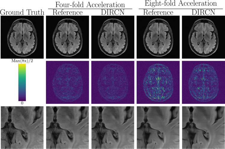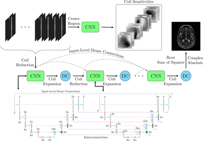 Results: The proposed densely interconnected residual cascading network (DIRCN), utilizing all three suggested modifications achieved a SSIM improvement of 8% and 11%, a NMSE improvement of 14% and 23%, and a PSNR improvement of 2% and 3% for four- and eightfold acceleration, respectively. In an ablation study, the individual architectural modifications all contributed to this improvement for both acceleration factors, by improving the SSIM, NMSE, and PSNR with approximately 2-4%, 4-9%, and 0.5-1%, respectively.