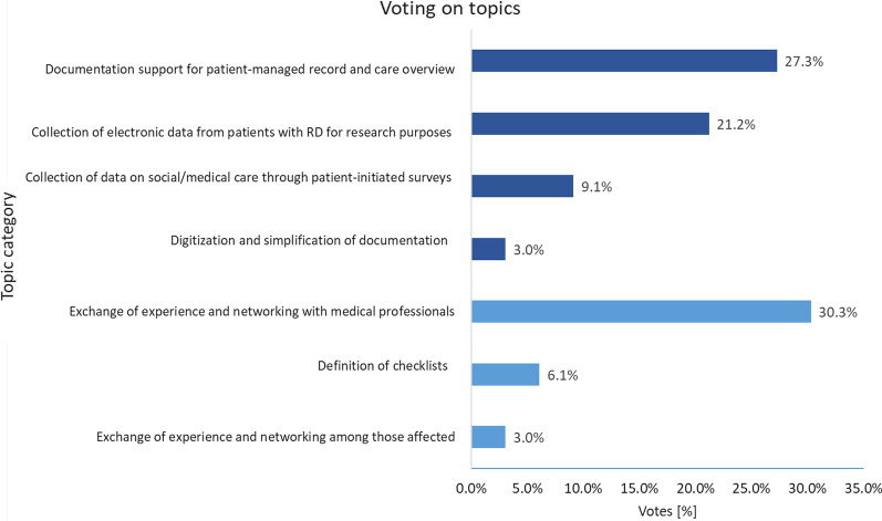Results: In the pre-survey, citizens suggested 45 different rare diseases and many different disease groups to be considered in the project. Two main project topics (A) "Patient-guided documentation and data collection" (20 votes) and (B) "Exchange of experience and networking" (13 votes) were identified as priorities in the workshops and ranked in the post-survey. The requirements workshop resulted in ten user stories and six initial requirements to be implemented in the digital application.