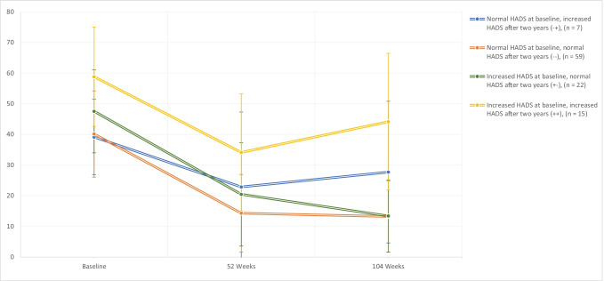 Methods: One hundred eight patients from the NECK trial, with radiculopathy due to a one-level herniated disc, underwent anterior cervical discectomy and were included into this analysis. Functional outcome was quantified using the Neck Disability Index (NDI), and mental health status was measured using the Hospital Anxiety and Depression Score (HADS) questionnaire. NDI differences were assessed using generalised estimated equations (GEE), crude means, a predictive linear mixed model (LMM) using baseline scores and over time with an explanatory LMM.