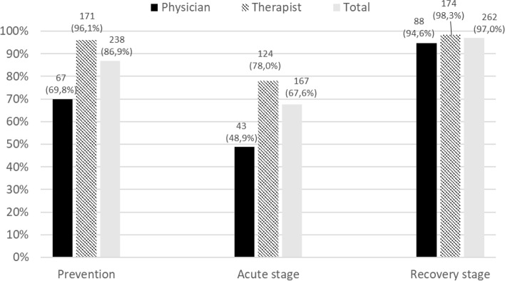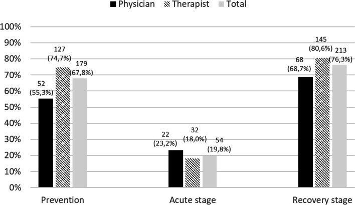 Results: Among the 320 participants, 76% consulted a patient regarding COVID-19 at least once. Overall, physicians and therapists consulted more patients during recovery (76.3%) and prevention (67.8%) than during the acute stage (19.8%) of the disease. Acupuncture was the most frequently used technique among TCM therapists and physicians consulting for prevention (80.4%) and recovery (92.5%), whereas Chinese pharmacopeia was the most used technique among those consulting for the acute stage (59.3%). Of those who closed their practices from March to April 2020 but kept consulting, telephone (30.4%) and home visits (29.9%) were the two principal methods of consultation.