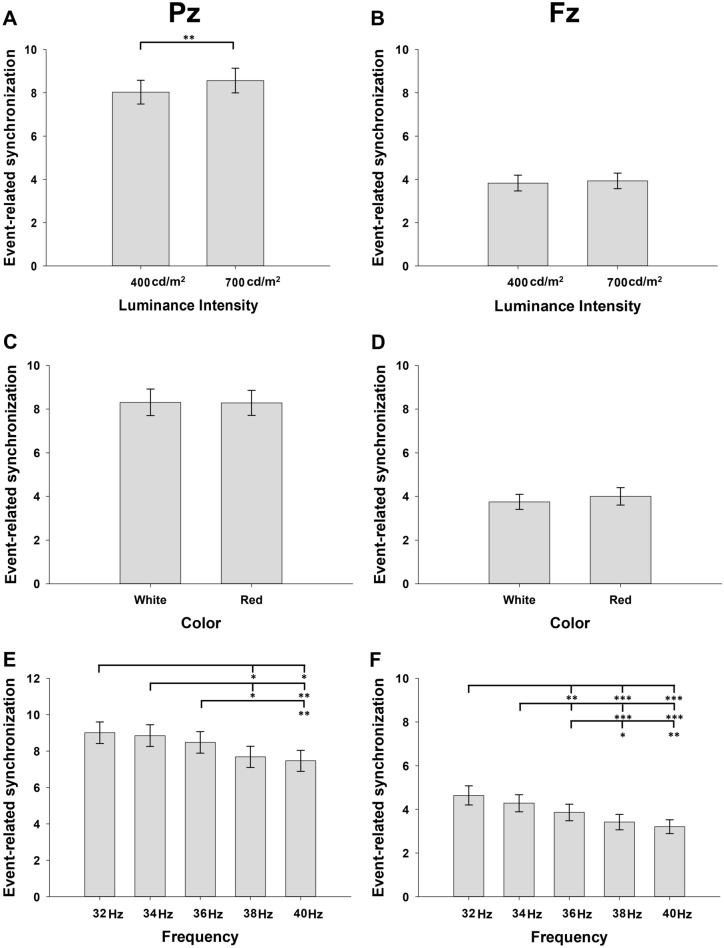 With aging, optimal parameters of flickering light stimulation (FLS) for gamma entrainment may change in the eyes and brain. We investigated the optimal FLS parameters for gamma entrainment in 35 cognitively normal old adults by comparing event-related synchronization (ERS) and spectral Granger causality (sGC) of entrained gamma rhythms between different luminance intensities, colors, and flickering frequencies of FLSs. ERS entrained by 700 cd/m2 FLS and 32 Hz or 34 Hz FLSs was stronger than that entrained by 400 cd/m2 at Pz (p < 0.01) and 38 Hz or 40 Hz FLSs, respectively, at both Pz (p < 0.05) and Fz (p < 0.01). Parieto-occipital-to-frontotemporal connectivities of gamma rhythm entrained by 700 cd/m2 FLS and 32 Hz or 34 Hz FLSs were also stronger than those entrained by 400 cd/m2 at Pz (p < 0.01) and 38 Hz or 40 Hz FLSs, respectively (p < 0.001). ERS and parieto-occipital-to-frontotemporal connectivities of entrained gamma rhythms did not show significant difference between white and red lights. Adverse effects were comparable between different parameters. In older adults, 700 cd/m2 FLS at 32 Hz or 34 Hz can entrain a strong gamma rhythm in the whole brain with tolerable adverse effects.