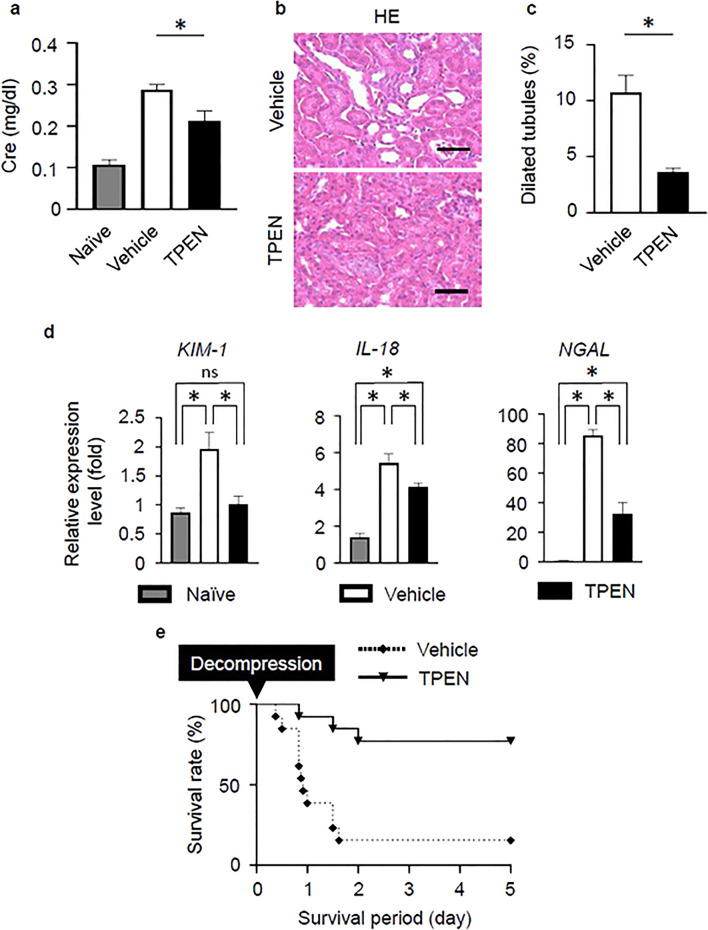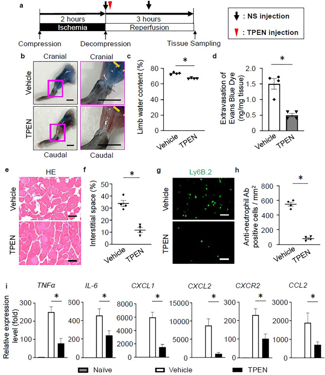 In crush syndrome, massive muscle breakdown resulting from ischemia-reperfusion muscle injury can be a life-threatening condition that requires urgent treatment. Blood reperfusion into the ischemic muscle triggers an immediate inflammatory response, and neutrophils are the first to infiltrate and exacerbate the muscle damage. Since free zinc ion play a critical role in the immune system and the function of neutrophils is impaired by zinc depletion, we hypothesized that the administration of a zinc chelator would be effective for suppressing the inflammatory reaction at the site of ischemia-reperfusion injury and for improving of the pathology of crush syndrome. A crush syndrome model was created by using a rubber tourniquet to compress the bilateral hind limbs of mice at 8 weeks. A zinc chelator N,N,N',N'-tetrakis-(2-pyridylmethyl)-ethylenediamine (TPEN) was administered immediately after reperfusion in order to assess the anti-inflammatory effect of the chelator for neutrophils. Histopathological evaluation showed significantly less muscle breakdown and fewer neutrophil infiltration in TPEN administration group compared with control group. In addition, the expression levels of inflammatory cytokine and chemokine such as IL-6, TNFα, CXCL1, CXCL2, CXCR2, CCL2 in ischemia-reperfusion injured muscle were significantly suppressed with TPEN treatment. Less dilatation of renal tubules in histological evaluation in renal tissue and significantly better survival rate were demonstrated in TPEN treatment for ischemia-reperfusion injury in crush syndrome. The findings of our study suggest that zinc chelators contributed to the resolution of exacerbation of the inflammatory response and attenuation of muscle breakdown in the acute phase after crush syndrome. In addition, our strategy of attenuation of the acute inflammatory reaction by zinc chelators may provide a promising therapeutic strategy not only for crush syndrome, but also for other diseases driven by inflammatory reactions.