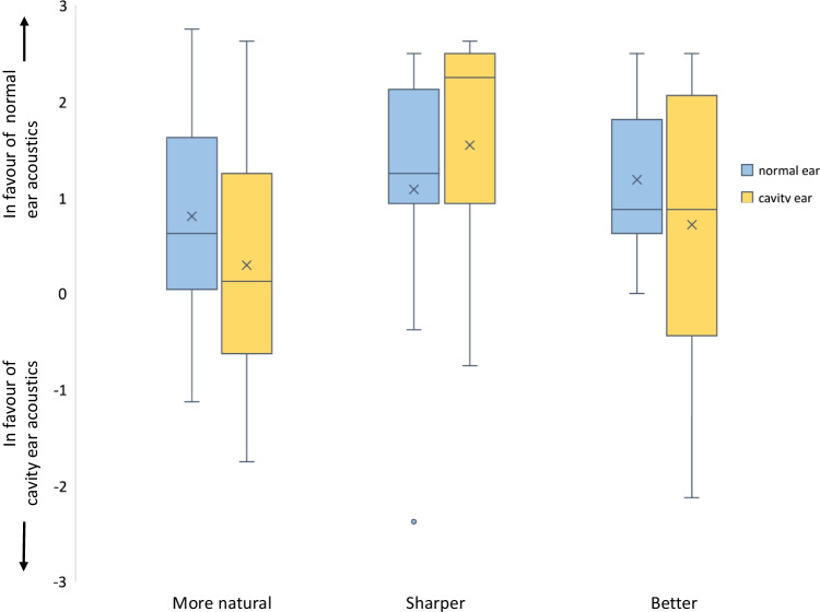 Methods: A total of 11 participants with single sided dry cavities and normal contralateral ear canals with normal hearing thresholds were included in the study. Filtered sound fragments were created that simulate the different acoustic properties based on the participants Real Ear to Coupler Difference (RECD) of the cavity ear and the contralateral normal ear canal. These filtered sound fragments are presented to the cavity ear canal and the contralateral normal ear canal using inserts earphones. Participants performed a subjective quality assessment of the sound fragments using paired comparison with a seven-point scale (- 3 till + 3).