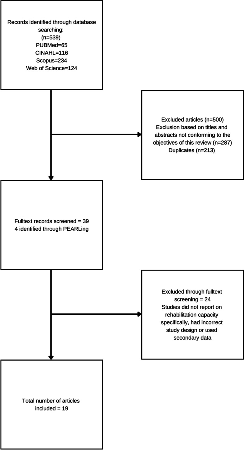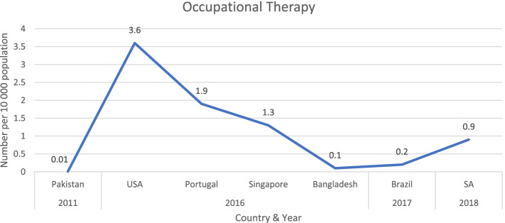 Results: Nineteen studies on rehabilitation workforce capacity were identified. All but one (a cross-sectional study) were database reviews. The main descriptors and indicators used to describe the rehabilitation workforce capacity were profession type, age, gender, distributions between urban/rural, level of care, and private/public sectors, absolute count totals, and population-adjusted ratios.