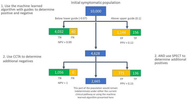 Conclusion: The performance of the machine learned algorithm presented here is comparable to common tertiary center testing for coronary artery disease. Employing multiple cut points on the receiver operating characteristic curve can yield the negative predictive value of coronary computed tomographic angiography and a positive predictive value approaching that of myocardial perfusion imaging. As such, a system employing this algorithm may address the need for a non-invasive, no radiation, no stress, front line test, and hence offer significant advantages to the patient, their physician, and healthcare system.