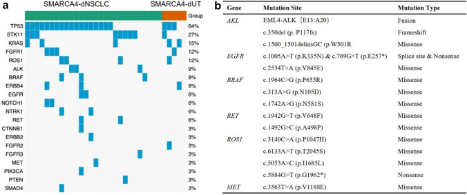 Results: Thirty-four SMARCA4-dNSCLC and 11 SMARCA4-dUT patients were included in this study. Molecular profiles were available in 33 out of 45 patients. The most common mutated gene was TP53 (21, 64%), and followed by STK11 (9, 27%), KRAS (5, 15%), FGFR1 (4, 12%) and ROS1 (4, 12%). There were 3 patients that harbored ALK mutation including 1 EML4-ALK rearrangement. There were 2 patients that harbored EGFR rare site missense mutation. SMARCA4-dUT patients had significance worse TTP (HR = 4.35 95% CI 1.77-10.71, p = 0.001) and OS (HR = 4.27, 95% CI 1.12-16.35, p = 0.022) compared to SMARCA4-dNSCLC patients. SMARCA4-dUT histologic type, stage II/III, R1/2 resection and lymphovascular invasion were independent poor prognostic predictors for both TTP and OS. There were 8 patients who received immunotherapy, the objective response rate was 50%. The SMARCA4-dNSCLC patient with ALK rearrangement was treated with crizotinib as second-line therapy, and achieved stable disease for 9.7 months.