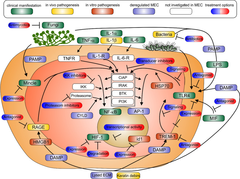 Middle ear cholesteatoma (MEC) is a destructive and locally invasive ulcerated lesion in the middle ear driven by inflammation which occurs in 10 out of 100,000 people annually. Surgical extraction/excision is the only treatment strategy available and recurrence is high (up to 40% after ten years), therefore developing the first pharmaceutical treatments for MEC is desperately required. This review is focused on the connections between inflammation and MEC pathogenesis. These connections can be used as attack points for pharmaceuticals. For this we summarized the results of research undertaken over the last 30 + years. MEC pathogenesis can be described by specific inflammatory dysregulation already known from arthritis, Crohn’s disease or multiple sclerosis. A hallmark of this dysregulation are positive feedback loops of the inflammation further amplifying itself in a vicious circle-like manner. We have identified over one hundred drugs which are already used in clinic to treat other inflammatory diseases, and could potentially be repurposed to treat MEC. To improve and expedite clinical success rates, we applied certain criteria based on our literature searches and condensed these drugs down to the 13 top drugs. We hope the review will serve as groundwork for the primary goal, which is to provide potential pharmaceutical therapies to MEC patients for the first time in history.