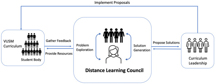 The pre-clinical medical school curriculum provides students with extraordinary experiences in preparation to become physicians. However, it was not originally designed to be delivered remotely. The COVID-19 pandemic promptly threw the medical education process into unforeseen circumstances. A model of student-faculty collaboration created to address new challenges and implement practical solutions rapidly is presented. This model was used effectively to respond to pre-clinical educational interruptions that were imposed by the COVID-19 pandemic and maintain high-quality training. Our experience provides valuable insights and lessons learned that can be applied to the ongoing pandemic response and to future educational challenges.