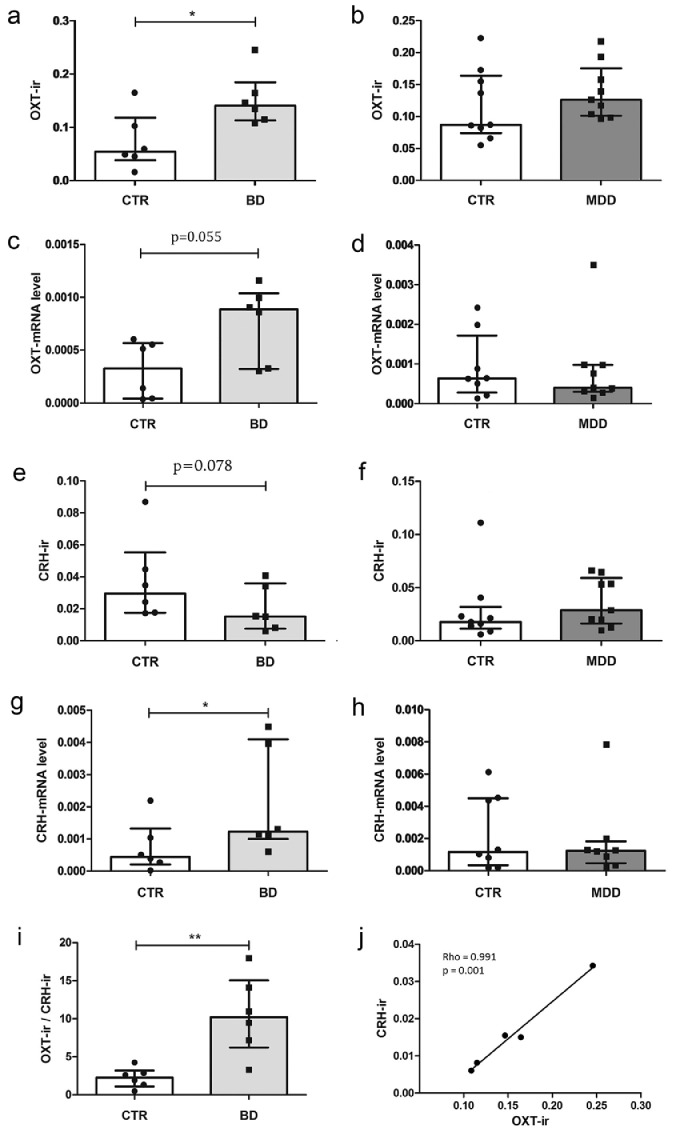 Methods: Quantitative immunocytochemistry and in situ hybridization were performed in the PVN for OXT and CRH on 6 BD and 6 BD-controls, 9 MDD and 9 MDD-controls. mRNA expressions of their receptors (OXTR, CRHR1 and CRHR2) were determined in anterior cingulate cortex and dorsolateral prefrontal cortex (DLPFC) of 30 BD and 34 BD-controls, and 24 MDD and 12 MDD-controls. PVN of 41 OXT-cre mice was short- or long-term activated by chemogenetics, and mood-related behavior was compared with 26 controls.