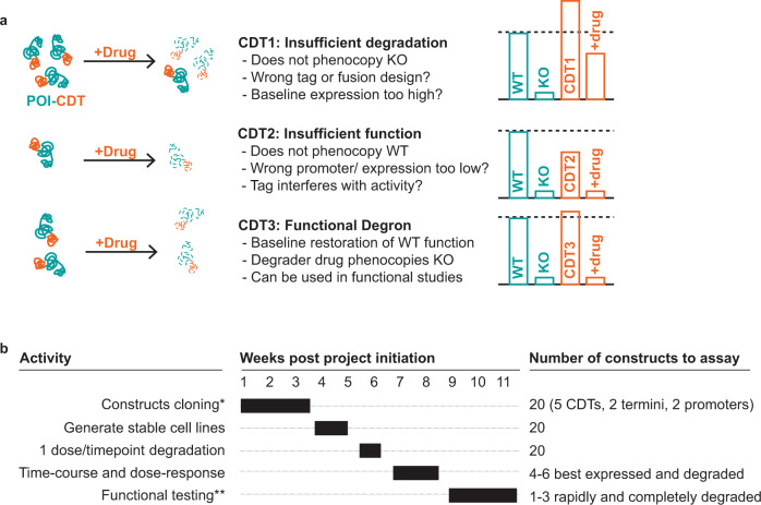 Conditional degron tags (CDTs) are a powerful tool for target validation that combines the kinetics and reversible action of pharmacological agents with the generalizability of genetic manipulation. However, successful design of a CDT fusion protein often requires a prolonged, ad hoc cycle of construct design, failure, and re-design. To address this limitation, we report here a system to rapidly compare the activity of five unique CDTs: AID/AID2, IKZF3d, dTAG, HaloTag, and SMASh. We demonstrate the utility of this system against 16 unique protein targets. We find that expression and degradation are highly dependent on the specific CDT, the construct design, and the target. None of the CDTs leads to efficient expression and/or degradation across all targets; however, our systematic approach enables the identification of at least one optimal CDT fusion for each target. To enable the adoption of CDT strategies more broadly, we have made these reagents, and a detailed protocol, available as a community resource.