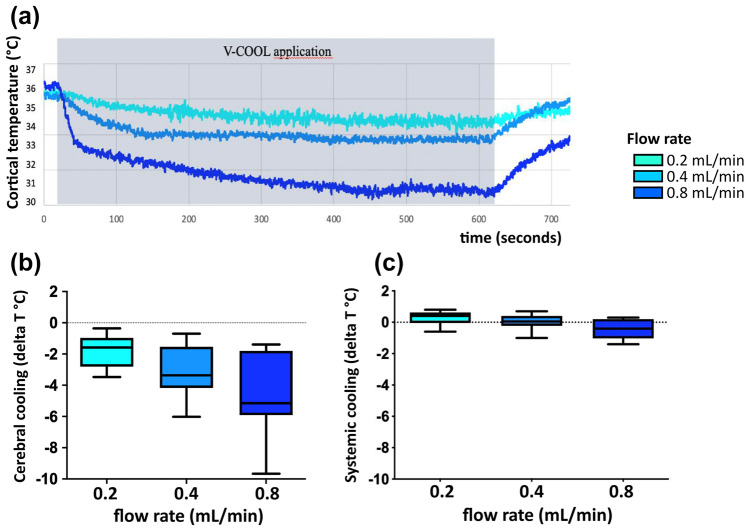 Hypothermia is a promising therapeutic strategy for severe vasospasm and other types of non-thrombotic cerebral ischemia, but its clinical application is limited by significant systemic side effects. We aimed to develop an intraventricular device for the controlled cooling of the cerebrospinal fluid, to produce a targeted hypothermia in the affected cerebral hemisphere with a minimal effect on systemic temperature. An intraventricular cooling device (acronym: V-COOL) was developed by in silico modelling, in vitro testing, and in vivo proof-of-concept application in healthy Wistar rats (n = 42). Cerebral cortical temperature, rectal temperature, and intracranial pressure were monitored at increasing flow rate (0.2 to 0.8 mL/min) and duration of application (10 to 60 min). Survival, neurological outcome, and MRI volumetric analysis of the ventricular system were assessed during the first 24 h. The V-COOL prototyping was designed to minimize extra-cranial heat transfer and intra-cranial pressure load. In vivo application of the V-COOL device produced a flow rate-dependent decrease in cerebral cortical temperature, without affecting systemic temperature. The target degree of cerebral cooling (- 3.0 °C) was obtained in 4.48 min at the flow rate of 0.4 mL/min, without significant changes in intracranial pressure. Survival and neurological outcome at 24 h showed no significant difference compared to sham-treated rats. MRI study showed a transient dilation of the ventricular system (+ 38%) in a subset of animals. The V-COOL technology provides an effective, rapid, selective, and safe cerebral cooling to a clinically relevant degree of - 3.0 °C.