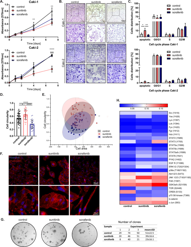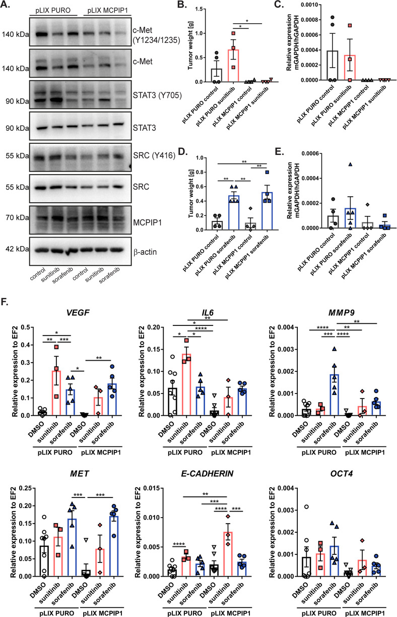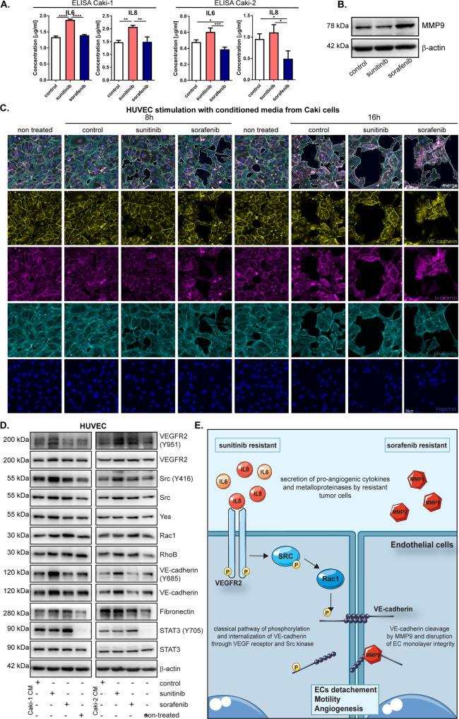 Tyrosine kinase inhibitors (TKIs) are the most commonly used targeted therapeutics in clear-cell renal cell carcinoma (ccRCC); however, drug resistance limits their utility and can lead to tumor "flare-up" and progression. In this study, we show that RCC resistance to sunitinib and sorafenib involves different mechanisms and leads to increased malignancy. Sunitinib decreased tumor growth and cell motility along with increased E-cadherin expression and secretion of the proangiogenic cytokines IL6 and IL8, which activated senescence in ccRCC cells and led to VE-cadherin phosphorylation, enhancing tumor angiogenesis. Sorafenib resistance increased the levels of mesenchymal markers and the secretion of MMP9, which cleaved VE-cadherin and disrupted endothelial cell integrity. Both sunitinib resistance and sorafenib resistance led to activation of the c-Met receptor IRAK1 and downregulation of the tumor suppressor MCPIP1, resulting in an increase in the metastasis of resistant cells, possibly due in part to enhanced vascularization of ccRCC. MCPIP1 overexpression partially overcame resistance to these drugs by decreasing micrometastasis and decreasing the expression of factors involved in tumorigenesis. In tumor samples from ccRCC patients, we observed a significant increase in the level of the c-Met receptor, IRAK1 and a decrease in MCPIP1 with respect to normal kidney tissue. Our results indicate separate novel mechanisms for sunitinib and sorafenib resistance, which both lead to MCPIP1 inhibition and ccRCC progression. The presented study suggests caution in the treatment of RCC with TKIs, which may lead to the unintended outcome of tumor progression.