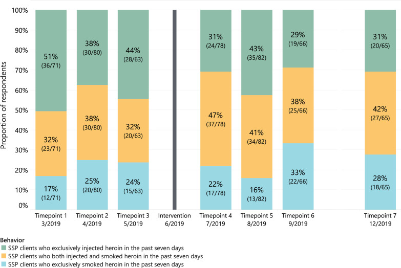 Methods: We conducted a pretest-posttest quasi-experimental study to evaluate the impact of heroin pipe distribution on drug consumption behaviors among PWUH between March and December 2019. SSP clients were surveyed during three weeklong timepoints before and four weeklong timepoints after heroin pipe distribution. Primary outcomes were change in proportion of SSP clients who exclusively injected heroin, exclusively smoked heroin, and both injected and smoked heroin in the past seven days comparing the pre- and post-intervention periods.