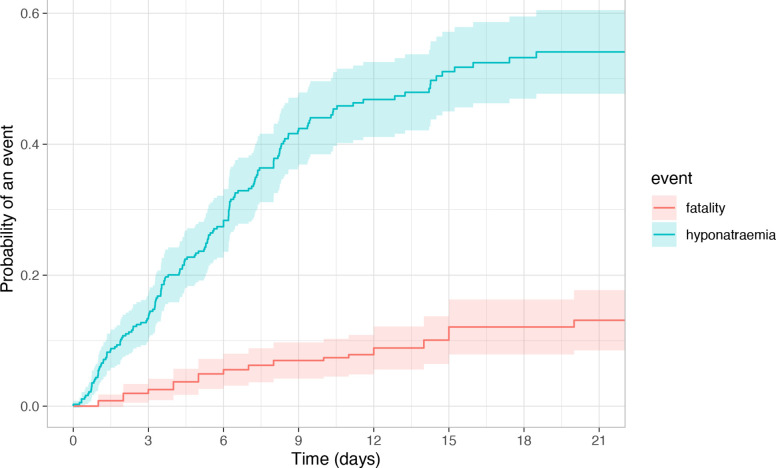 Methods: We prospectively identified consecutive patients with spontaneous SAH admitted to neurosurgical units in the United Kingdom or Ireland. We reviewed medical records daily from admission to discharge, 21 days or death and extracted all measurements of serum sodium to identify hyponatraemia (<135 mmol/L). Main outcomes were death/dependency at discharge or 21 days and admission duration >10 days. Associations of hyponatraemia with outcome were assessed using logistic regression with adjustment for predictors of outcome after SAH and admission duration. We assessed hyponatraemia-free survival using multivariable Cox regression.