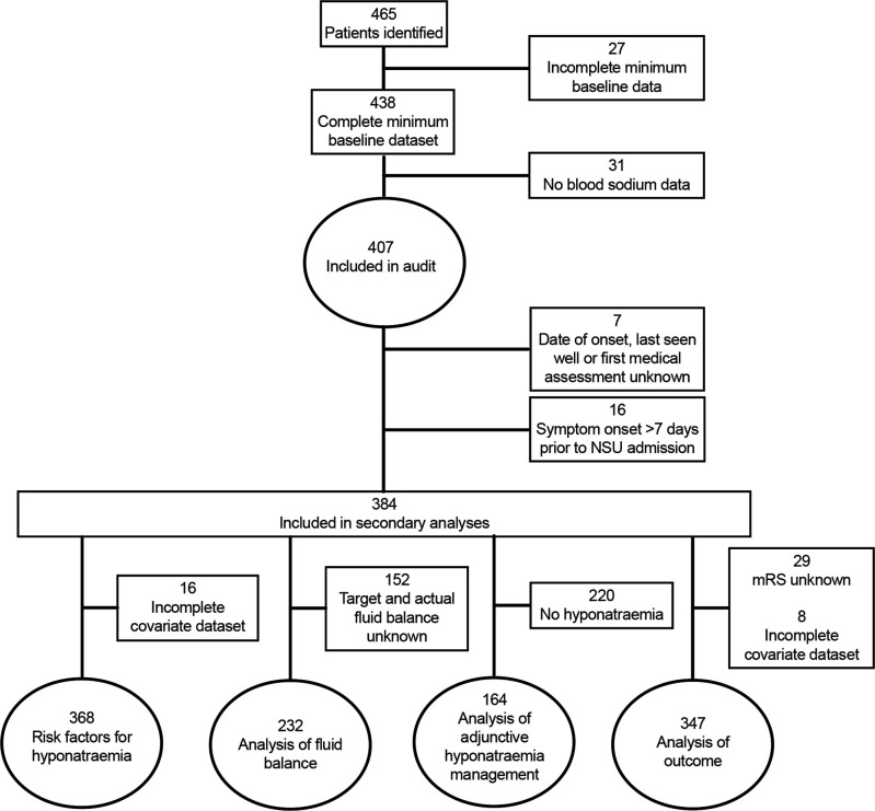 Conclusions: In this comprehensive multicentre prospective-adjusted analysis of patients with SAH, hyponatraemia was investigated inconsistently and, for most patients, was not associated with changes in management or clinical outcome. This work establishes a basis for the development of evidence-based SAH-specific guidance for targeted screening, investigation and management of high-risk patients to minimise the impact of hyponatraemia on admission duration and to improve consistency of patient care.