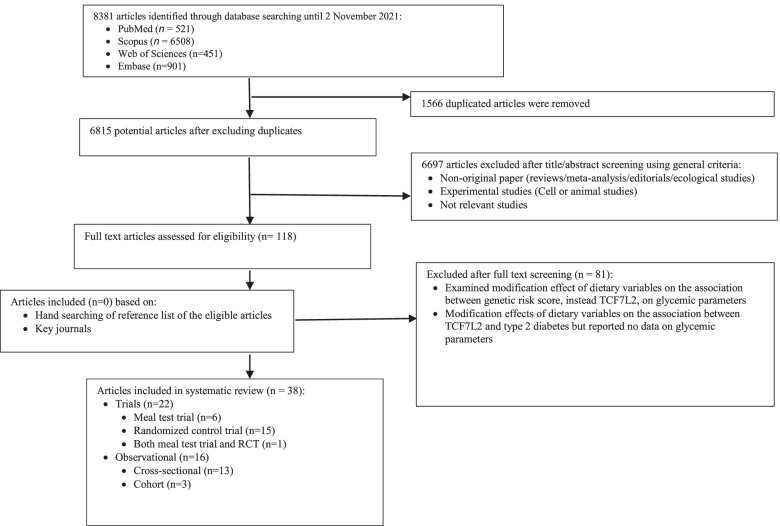 Results: Thirty-eight studies (16 observational studies, six meal test trials, and 16 randomized controlled trials (RCTs)) were included. Most observational studies had been conducted on participants with non-diabetes showing that TCF7L2 modified the association between diet (fatty acids and fiber) and insulin resistance. In addition, findings from meal test trials showed that, compared to non-risk-allele carriers, consumption of meals with different percentages of total dietary fat in healthy risk-allele carriers increased glucose concentrations and impaired insulin sensitivity. However, ten RCTs, with intervention periods of less than ten weeks and more than one year, showed that TCF7L2 did not modify glycemic parameters in response to a dietary intervention involving different macronutrients. However, two weight loss dietary RCTs with more than 1-year duration showed that serum glucose and insulin levels decreased and insulin resistance improved in non-risk allele subjects with overweight/obesity. Regarding artichoke extract supplementation (ALE), two RCTs observed that ALE supplementation significantly decreased insulin concentration and improved insulin resistance in the TT genotype of the rs7903146 variant of TCF7L2. In addition, four studies suggested that physical activity levels and smoking status modified the association between TCF7L2 and glycemic parameters. However, three studies observed no effect of TCF7L2 on glycemic parameters in participants with different levels of physical activity and smoking status.