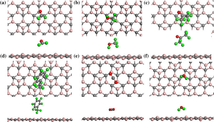 Nanomaterial-based room temperature gas sensors are used as a screening tool for diagnosing various diseases through breath analysis. The stable planar structure of boron carbide (B4C3) is utilized as a base material for adsorption of human breath exhaled VOCs, namely formaldehyde, methanol, acetone, toluene along, with interfering gases of carbon dioxide and water. The adsorption energy, charge density, density of states, energy band gap variation, recovery time, sensitivity, and work function of adsorbed molecules on pristine B4C3 are analyzed by density functional theory. The computed adsorption energies of VOC are in the range of - 0.176 to - 0.238 eV, and a larger interaction distance validate the physisorption behavior of these VOCs biomarkers on pristine boron carbide monolayer. Minute changes are determined from the electronic band structure of all adsorbed systems conserving the semiconducting nature of the B4C3 monolayer. The band gap variation upon adsorption of VOCs and interfering gases is examined between 0.05 and 0.52%. The 13.63 × 10-9 s recovery time of methanol is slower among VOCs, and 0.556 × 10-9 s of carbon dioxide (CO2) is faster for desorption. The results reveal that boron carbide can be utilized as a biosensor at room temperature for the analysis of exhaled VOCs from human breath.