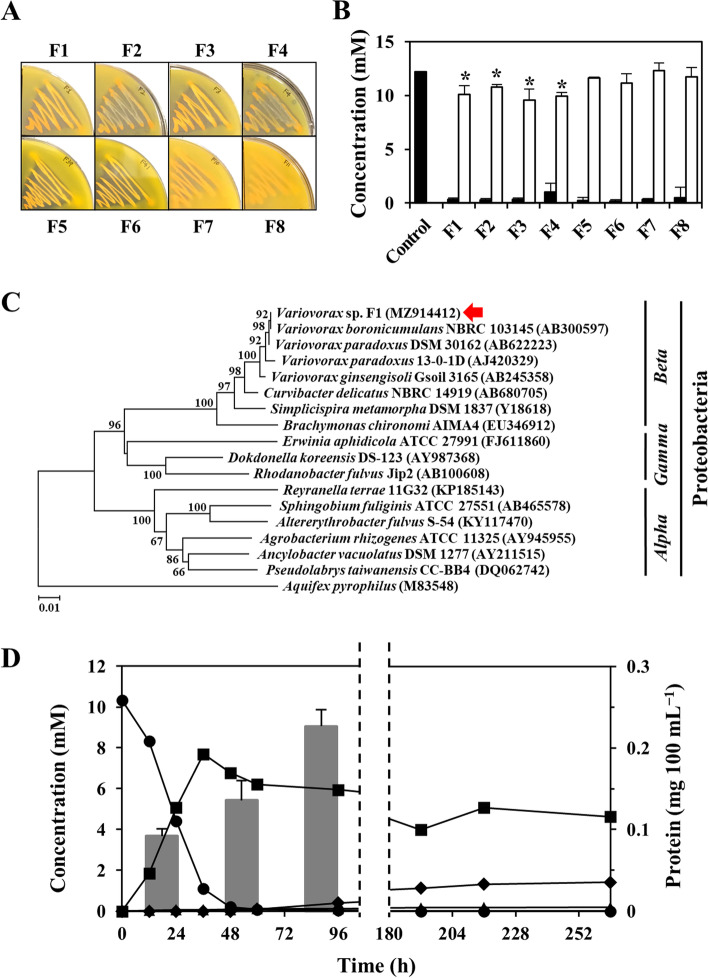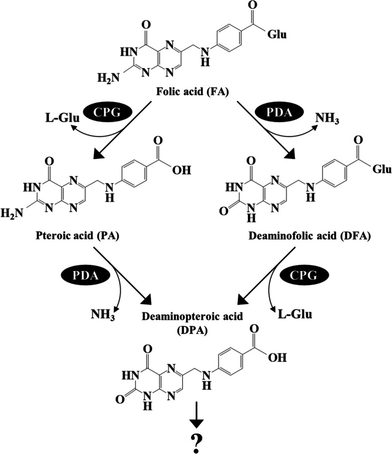 Results: We isolated the soil bacterium Variovorax sp. F1 from sampled weed rhizospheres in a grassland and investigated its FA degradation mechanism. Cultured Variovorax sp. F1 rapidly degraded FA to pteroic acid (PA), indicating that FA hydrolysis to PA and glutamate. We cloned the carboxypeptidase G (CPG) gene and found widely distributed paralogs within the Variovorax genus. Recombinant CPG preferred FA and deaminofolic acid as substrates, indicating its involvement in FA degradation by Variovorax. Prolonged culture of Variovorax sp. F1 resulted in decreased rates of deaminofolic acid (DFA) and deaminopteroic acid (DPA) accumulation. This indicated that the deamination reaction also comprised a route of FA degradation. We also identified an F1 gene that was orthologous to the pterin deaminase gene (Arad3529) of Agrobacterium radiobacter. The encoded protein deaminated FA and PA to DFA and DPA, which was consistent with the deamination activity of FA and PA in bacterial cell-free extracts.