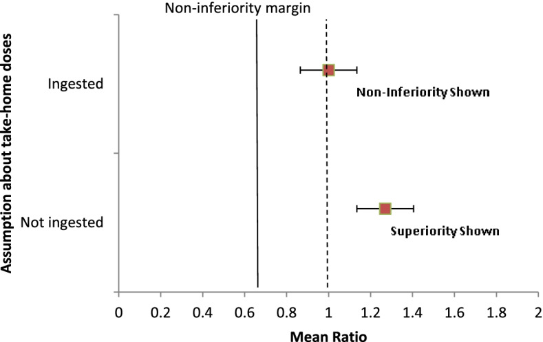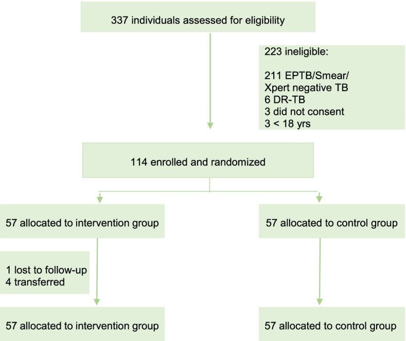 Results: Participants were enrolled into the study between 02 June 2020 and 15 June 2021, with the last participant completing follow-up on 15 August 2021. A total of 337 patients were screened for eligibility, of whom 114 were randomly assigned and included in the final analysis [57 control and 57 intervention participants]. Participants were 64.9% male, 15% with HIV, 10.5% retreatment, and 5.3% homeless. Adherence to TB medication was comparable between the intervention arm [geometric mean percentage (GM%) 99.01%, geometric standard deviation (GSD) 1.02] and the control arm [GM% 98.97%, GSD 1.04] and was within the prespecified margin for non-inferiority [mean ratio (MR) 1.00 (95% CI 0.99-1.01); p = 0.954]. The intervention arm was significantly superior to the control arm in the secondary analysis that considered all take-home doses in the control were not ingested [control GM% 77.71 (GSD 1.57), MR 1.27 (95% CI 1.33-1.43)]. Urine isoniazid testing was done on 443 (97%) samples from 114 participants; 13 participants had at least one negative result; a negative test was significantly more common among the control group compared with the intervention group [11/57 (19.3%) vs 2/57 (3.5%); p = 0.008]. There was no significant difference between the control and intervention arms for smear conversion [55 (98.2%) vs 52 (100%); p>0.999], adverse treatment outcomes [0 vs 1 (1.9%); p = 0.48], and self-report non-adherence [5 (8.9%) vs 1 (1.9%); p = 0.21].