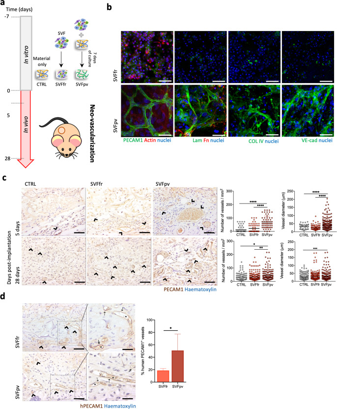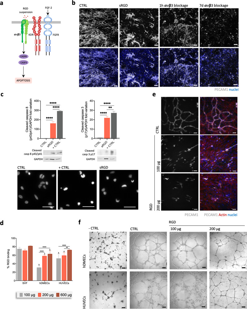 Integrin-binding biomaterials have been extensively evaluated for their capacity to enable de novo formation of capillary-like structures/vessels, ultimately supporting neovascularization in vivo. Yet, the role of integrins as vascular initiators in engineered materials is still not well understood. Here, we show that αvβ3 integrin-specific 3D matrices were able to retain PECAM1+ cells from the stromal vascular fraction (SVF) of adipose tissue, triggering vasculogenesis in vitro in the absence of extrinsic growth factors. Our results suggest that αvβ3-RGD-driven signaling in the formation of capillary-like structures prevents the activation of the caspase 8 pathway and activates the FAK/paxillin pathway, both responsible for endothelial cells (ECs) survival and migration. We also show that prevascularized αvβ3 integrin-specific constructs inosculate with the host vascular system fostering in vivo neovascularization. Overall, this work demonstrates the ability of the biomaterial to trigger vasculogenesis in an integrin-specific manner, by activating essential pathways for EC survival and migration within a self-regulatory growth factor microenvironment. This strategy represents an improvement to current vascularization routes for Tissue Engineering constructs, potentially enhancing their clinical applicability.