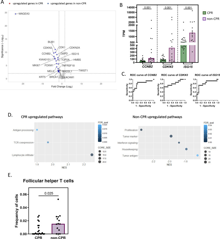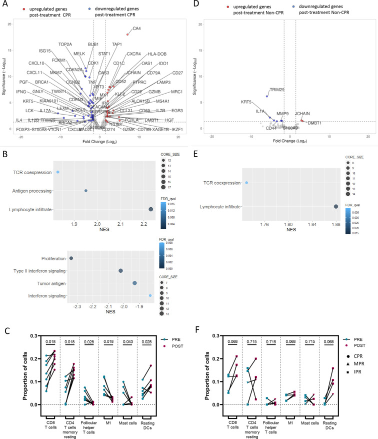 Methods: Tumor bulk RNA sequencing was performed in 16 pretreatment and 36 post-treatment tissue samples from 41 patients with resectable stage IIIA NSCLC treated with neoadjuvant chemoimmunotherapy from NADIM trial. A panel targeting 395 genes related to immunological processes was used. Tumors were classified as complete pathological response (CPR) and non-CPR, based on the total absence of viable tumor cells in tumor bed and lymph nodes tested at surgery. Differential-expressed genes between groups and pathway enrichment analysis were assessed using DESeq2 and gene set enrichment analysis. CIBERSORTx was used to estimate the proportions of immune cell subtypes.