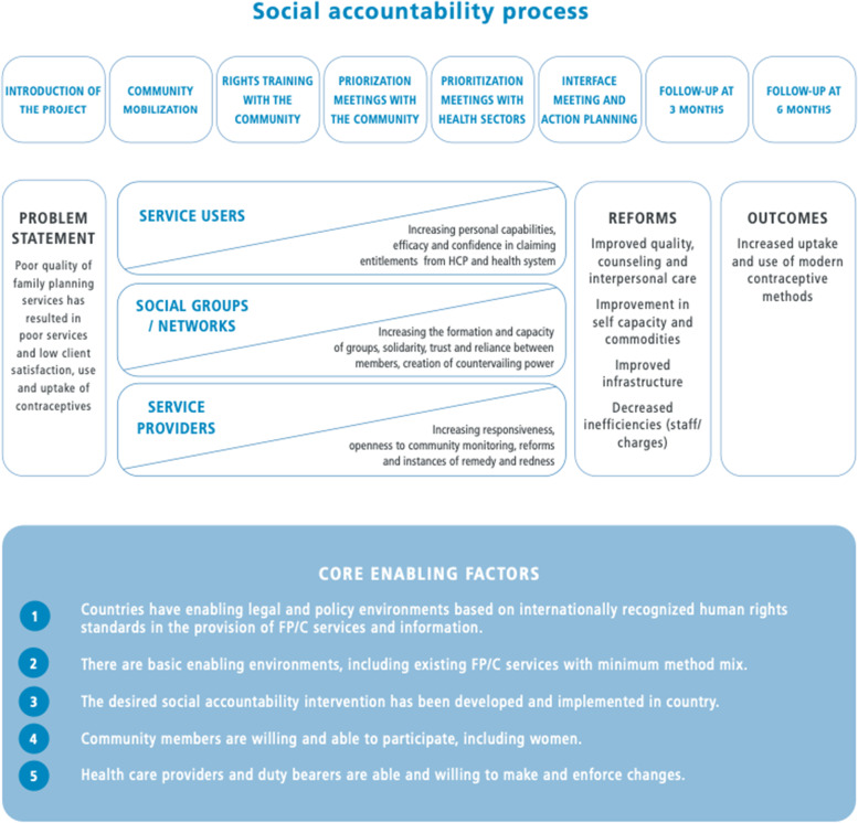 Background: Social accountability, which is defined as a collective process for holding duty bearers and service providers to account for their actions, has shown positive outcomes in addressing the interrelated barriers to quality sexual and reproductive health services. The Community and Provider driven Social Accountability Intervention (CaPSAI) Project contributes to the evidence on the effects of social accountability processes in the context of a family planning and contraceptive programme.
