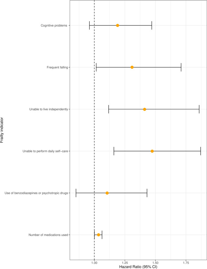 Methods: A cohort study in which consecutive CSDH patients were compared to the general population regarding mortality rates. Furthermore, the association of six frailty indicators (cognitive problems, frequent falling, unable to live independently, unable to perform daily self-care, use of benzodiazepines or psychotropic drugs, and number of medications) with mortality was assessed.