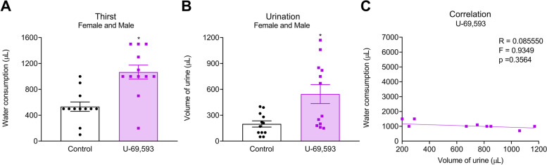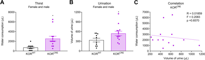 Results: Systemic administration of U-69,593 increased urination but did not produce yawning in rats. Systemic KOR agonist also increased urination in mice as well as water consumption. Cell specific Gi-DREADD activation (i.e., inhibition through Gi-coupled signaling) of KORCRE neurons in the ARC also increased water consumption and the total volume of urine in mice but did not affect tactile sensory responses.