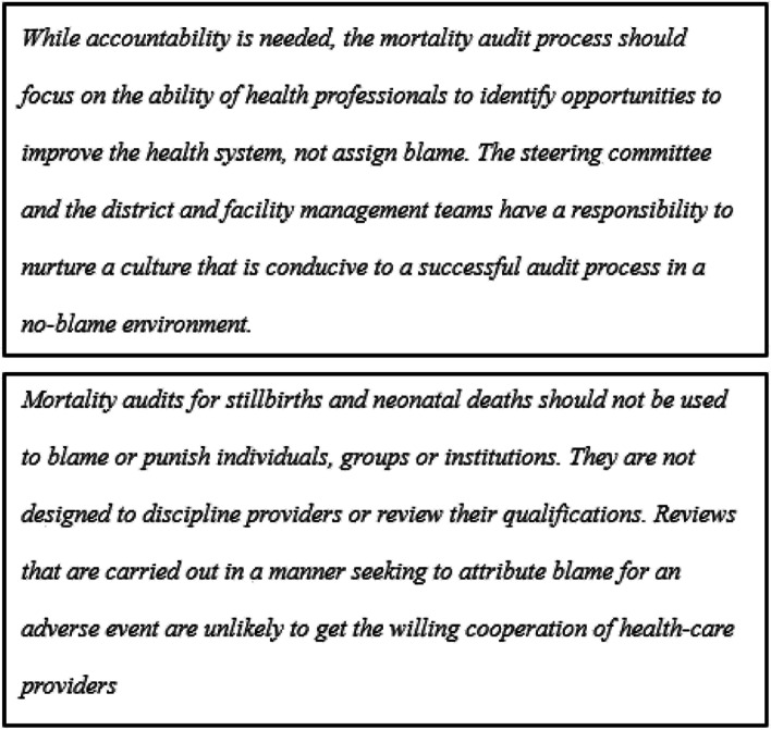 Results: Participants experienced fear of punishment and blame in relation to the perinatal death auditing process. They found that auditing did not contribute to reducing perinatal deaths and that their motivation to stick to the obligation was negatively affected by this. Performing audits without available resources to provide optimal care or support in the current system was perceived as unfair. Some hid information or misreported information in order to avoid accusations of misconduct when they felt they were not to blame for the baby's death. Coping strategies such as engaging in exceedingly larger work efforts, overtreating patients, or avoiding complicated medical cases were described.