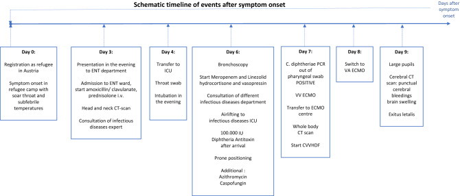 Result: This was the first case of respiratory diphtheria in Austria since 1993. Diphtheria antitoxin was administered at an already progressed disease stage. This delay contributed to a fulminant disease course with multiorgan failure and death.