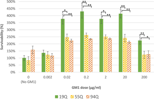 Method and result: This study utilized cell culture to analyze the effect of GM1 on cell viability, directly comparing the response between cells with adult-onset HD and juvenile-onset HD. HEK293 cells expressing either wild-type huntingtin (Htt) (19Q) exon 1, adult-onset HD mutant Htt exon 1 (55Q), or Juvenile HD mutant Htt exon 1 (94Q) were assessed for cell viability using the WST-1 assay. Our results suggested moderate doses of GM1 increased cell viability for all cell lines when compared to untreated cells. When comparing HEK293 55Q and 94Q cells, there was no difference in cell viability within each dose of GM1.