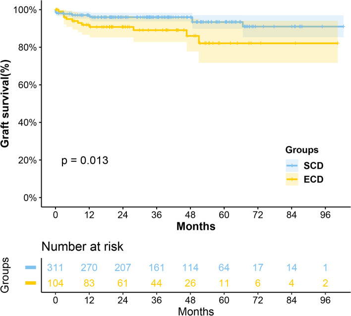 Method: A retrospective study enrolled 415 kidney transplants derived from 211 donors performed between October 2011 and October 2019. A total of 311 (74.9%) organs were donated from 159 (75.4%) SCDs, and the remaining 104 (25.1%) were from 52 (24.6%) ECDs. The log-rank test was used to compare the difference in survival and postoperative complications. The Chi-square test was used to compare the occurrence of postoperative complications and postoperative renal function. The Cox regression analysis was used for risk factor screening.