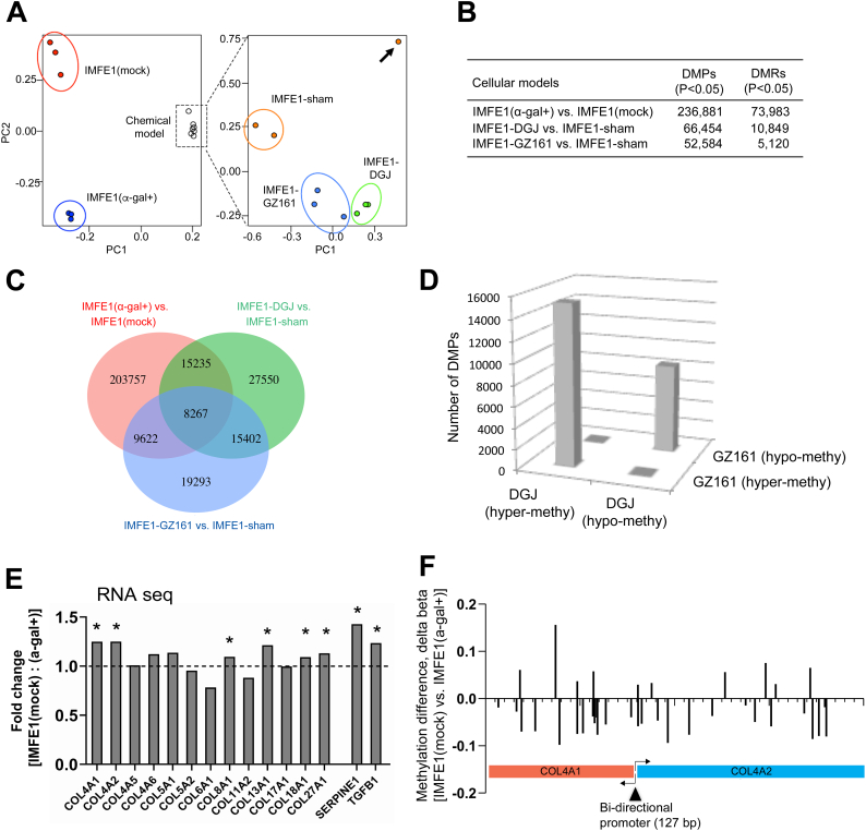 Fabry disease is an X-linked lysosomal storage disorder caused by a deficiency of α-galactosidase A and subsequent accumulation of glycosphingolipids with terminal α-D-galactosyl residues. The molecular process through which this abnormal metabolism of glycosphingolipids causes multisystem dysfunction in Fabry disease is not fully understood. We sought to determine whether dysregulated DNA methylation plays a role in the development of this disease. In the present study, using isogenic cellular models derived from Fabry patient endothelial cells, we tested whether manipulation of α-galactosidase A activity and glycosphingolipid metabolism affects DNA methylation. Bisulfite pyrosequencing revealed that changes in α-galactosidase A activity were associated with significantly altered DNA methylation in the androgen receptor promoter, and this effect was highly CpG loci-specific. Methylation array studies showed that α-galactosidase A activity and glycosphingolipid levels were associated with differential methylation of numerous CpG sites throughout the genome. We identified 15 signaling pathways that may be susceptible to methylation alterations in Fabry disease. By incorporating RNA sequencing data, we identified 21 genes that have both differential mRNA expression and methylation. Upregulated expression of collagen type IV alpha 1 and alpha 2 genes correlated with decreased methylation of these two genes. Methionine levels were elevated in Fabry patient cells and Fabry mouse tissues, suggesting that a perturbed methionine cycle contributes to the observed dysregulated methylation patterns. In conclusion, this study provides evidence that α-galactosidase A deficiency and glycosphingolipid storage may affect DNA methylation homeostasis and highlights the importance of epigenetics in the pathogenesis of Fabry disease and, possibly, of other lysosomal storage disorders.
