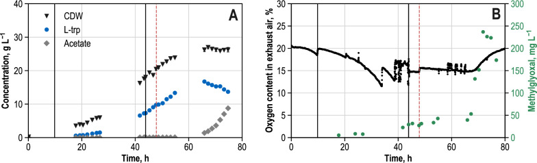 Conclusions: A detailed process analysis of a new L-tryptophan producer strain revealed that several of the 4 targeted genetic modifications of the E. coli L-tryptophan producer strain proved to be effective, and, for others, new engineering approaches could be derived from the results. As a starting point for further strain and process optimization, the up-regulation of MGO detoxifying enzymes and a lowering of the feeding rate during the last third of the cultivation seems reasonable.