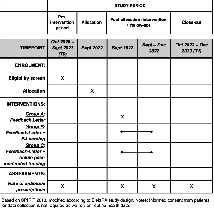 Method: ElektRA is a 4-arm cluster-randomized controlled trial among German GPs in nine regional Associations of Statutory Health Insurance Physicians. On their behalf, the Central Research Institute of Ambulatory Health Care in Germany (Zi) analyses all outpatient claims and prescription data. Based on this database, high antibiotic prescribing GPs are identified and randomized into four groups: a control group (N=2000) and three intervention arms. We test social norm feedback on antibiotic prescribing (N=2000), social norm feedback plus online training on rational prescribing practice and communication strategies (N=2000), and social norm feedback plus online peer-moderated training on rational antibiotic prescribing, communication strategies, and sustainable behavior change (N=1250). The primary outcome is the overall rate of antibiotic prescriptions. Outcomes are measured before intervention (T0, October 2020-September 2022) and over a period of 15 months (T1, October 2022 to December 2023) after randomization.