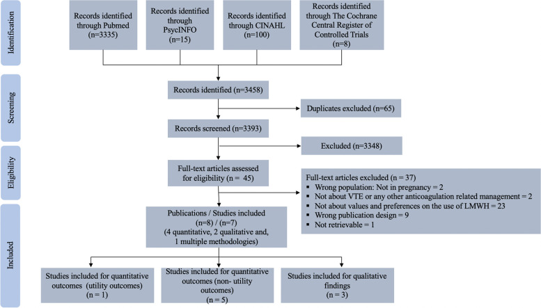 Results: We screened 3,393 references and identified seven eligible studies. The mixed methods analysis resulted in four themes. Datasets confirmed each other in that: 1) the majority of women consider that benefits of treatment outweigh the inconveniences of daily injections; and 2) main concerns around medication are safety and injections administration. Quantitative outcomes expanded on the qualitative findings in that: 3) participants who perceived a higher risk of VTE were more willing to take LMWH. Finally, we found a discrepancy between the datasets around: 4) the amount of information preferred to make the decision; however, qualitative data expanded to clarify that women prefer making informed decisions and receive support from their clinician in their decision-making process.
