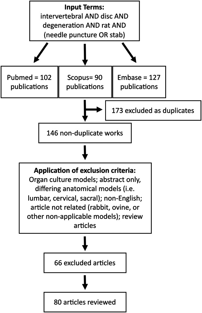 Back pain is a global epidemiological and socioeconomic problem often associated with intervertebral disc degeneration; a condition believed to initiate in the nucleus pulposus (NP). There is considerable interest in developing early therapeutic interventions to target the NP and halt degeneration. Rat caudal models of disc degeneration have demonstrated significant utility in the study of disease progression and its impact on tissue structure, composition, and mechanical performance. One significant advantage of the caudal model is the ease of access and high throughput nature. However, considerable variability exists across the literature in terms of experimental setup and parameters. The objective of this article is to aid researchers in the design and development of caudal puncture models by providing details and insight into the most reported experimental parameters. Preferred Reporting Items for Systematic Reviews and Meta-Analyses (PRISMA) guidelines were employed to screen the existing literature and 80 manuscripts met the inclusion criteria. Disc geometry, surgical approaches, effect of needle gauge size to induce degeneration, therapeutic volume, outcome measures, and associated limitations are considered and discussed, and a range of recommendations based on different research questions are presented.