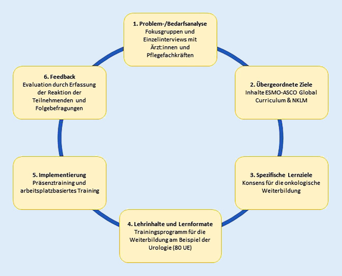 Methods: A needs assessment was conducted using focus groups and individual interviews. Learning objectives were aligned with (inter)national learning objective catalogs. The ICT was developed using the six-step approach according to Kern and design-based research. Utilization and acceptance were evaluated. The ICT comprised six face-to-face workshops (50 teaching units) and team supervision sessions (10 teaching units). Six defined settings were identified for the individual workplace-based training (20 teaching units): Ward rounds, handover, reporting of medical findings, admission and discharge interviews, and a freely choosable setting.