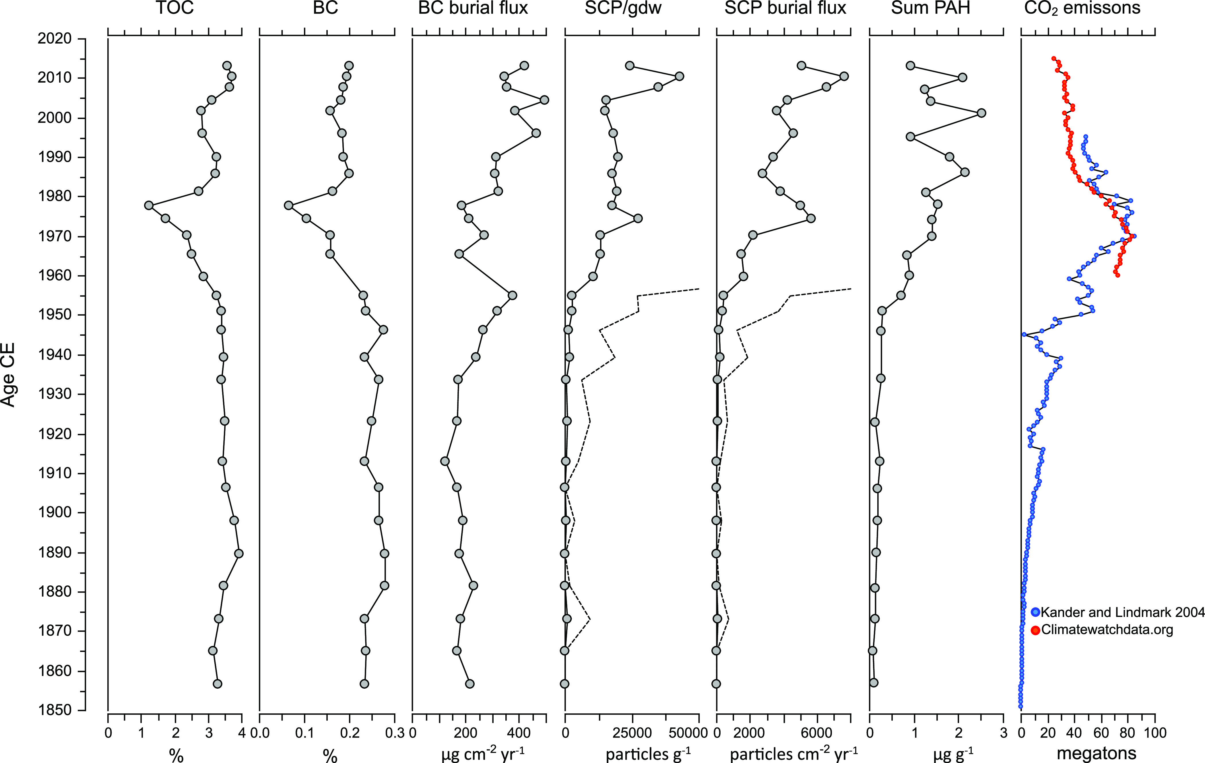 Black carbon (BC), spheroidal carbonaceous particles (SCP), and polycyclic aromatic hydrocarbons (PAH) are carbonaceous pollutants affecting the climate, environment, and human health. International regulations limit their emissions, and the present emissions are followed by monitoring programs. However, the monitoring programs have limited spatio-temporal coverage and only span the last decades. We can extend the knowledge of historical emission rates by measuring pollution levels in radiometrically dated marine and lacustrine sediment sequences. Here we present measurements of BC, SCP, and PAH from a sediment sequence sampled in the Öresund strait, between Denmark and Sweden and dated back to CE 1850. Our data show a massive increase in the burial rates of all measured pollutants starting in the 1940s. The pollution deposition peaked in the 1970-1980s and declined through the 1990s. However, the declining trend was reversed in the 2000s. Source appointment of PAHs shows a relatively higher contribution of emissions from wood-burning since CE 2000. This coincides with a change towards the increased use of biomass for both municipal and regional energy production in Scandinavia. Our results demonstrate that changes in energy production have caused changes in the delivery of carbonaceous pollution to marine environments. The increase in particle emissions from wood burning is potentially posing a future environmental and health risk.